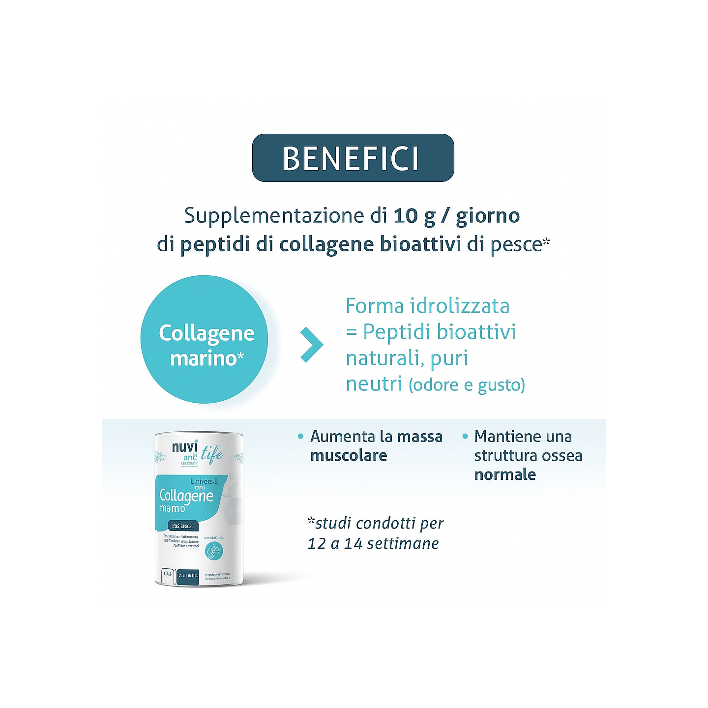- L'integrazione con 10 g/giorno di peptidi di collagene bioattivi provenienti dal pesce è stata effettuata per 12-14 settimane.