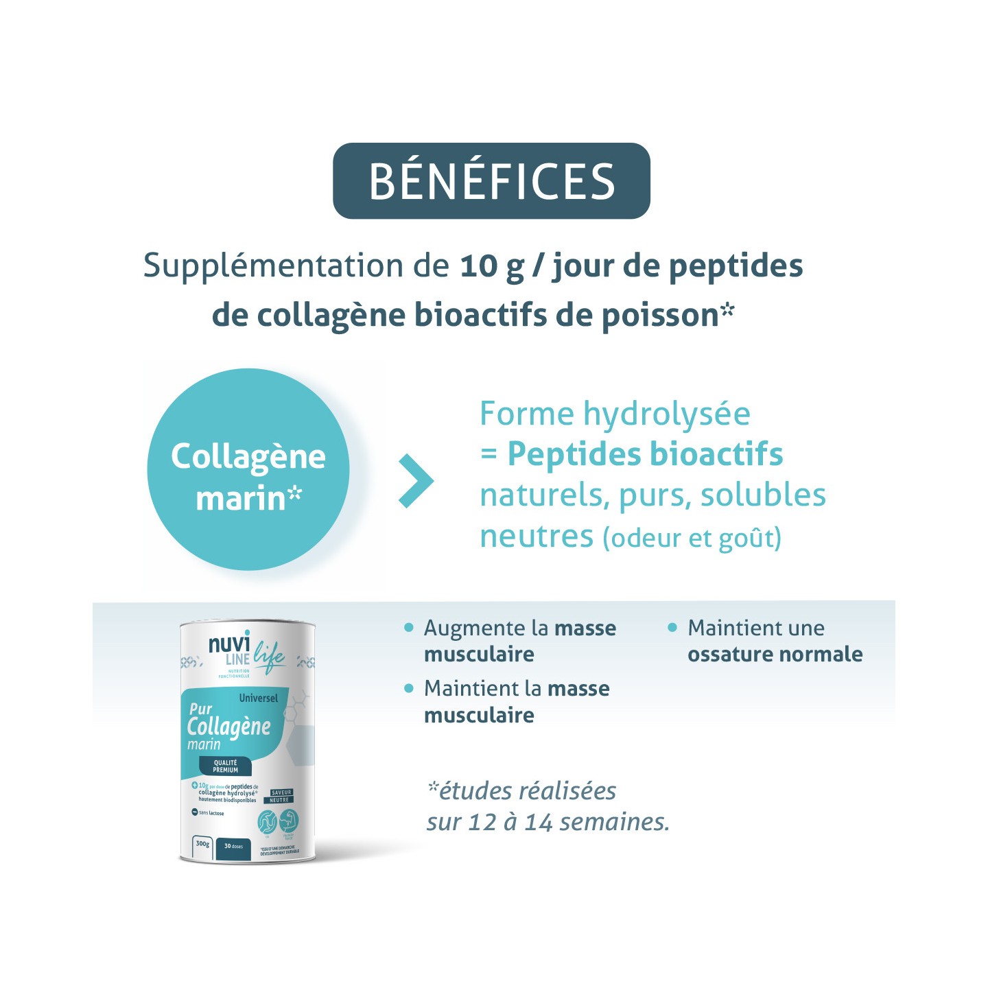 - La forma peptidica deriva dal collagene universale naturale di tipo 1 tagliato per ottenere pezzi più piccoli (idrolisi enzimatica) e quindi più facilmente digeribili. Questi blocchi specifici, unici e pronti all'uso, permettono all'organismo di produrre "meglio" e più rapidamente il collagene di ogni tipo (1, 2, 3, ecc.) , aseconda delle esigenze di ciascun tessuto (articolazioni, ossa, muscoli, pelle, ecc.).