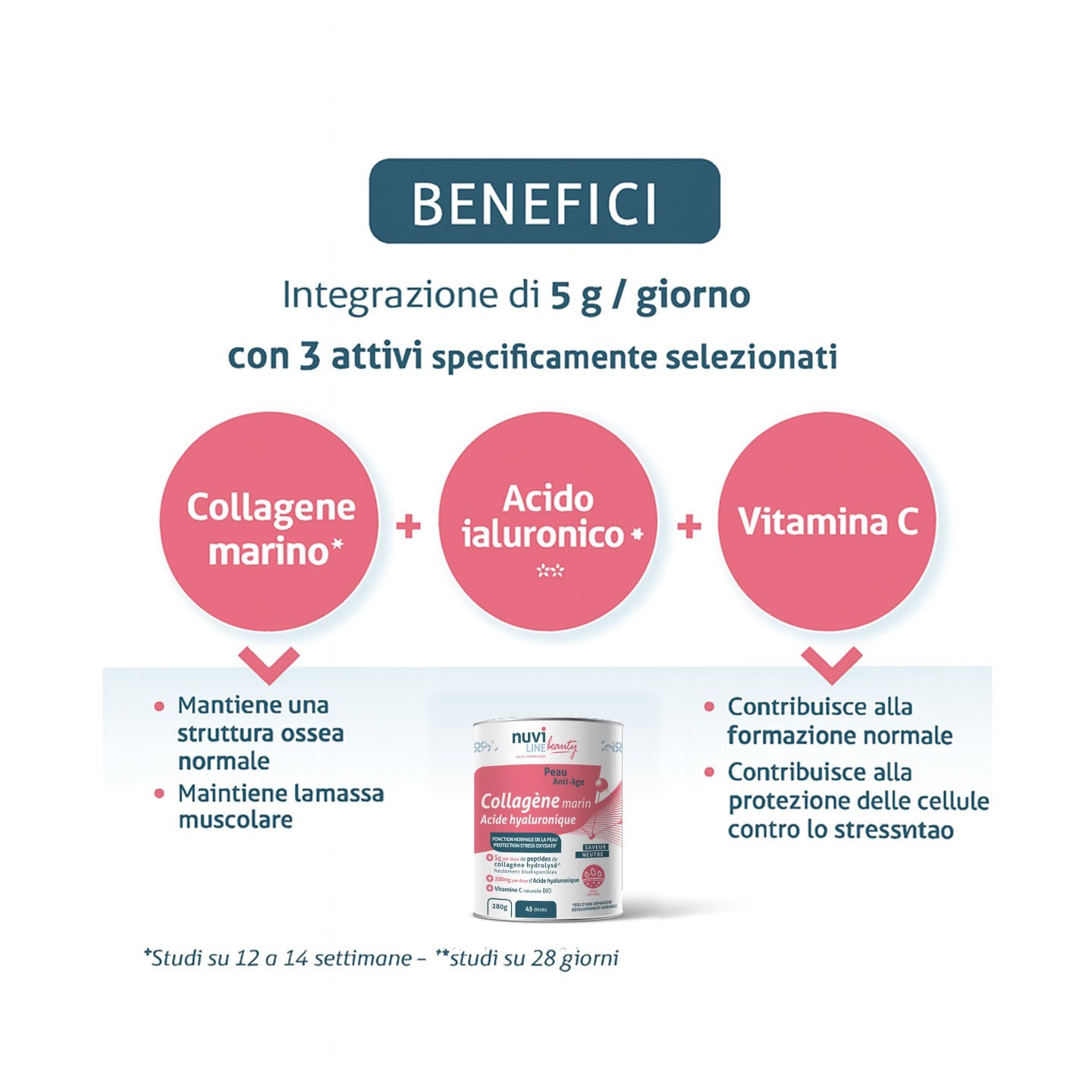 - Il collagene è un componente naturalmente presente nell'organismo (muscoli, pelle, ossa, tendini, cartilagini, ecc.) dove svolge un ruolo importante di sostegno e/o elasticità.